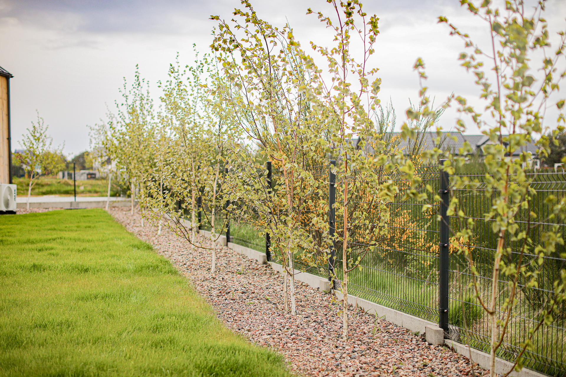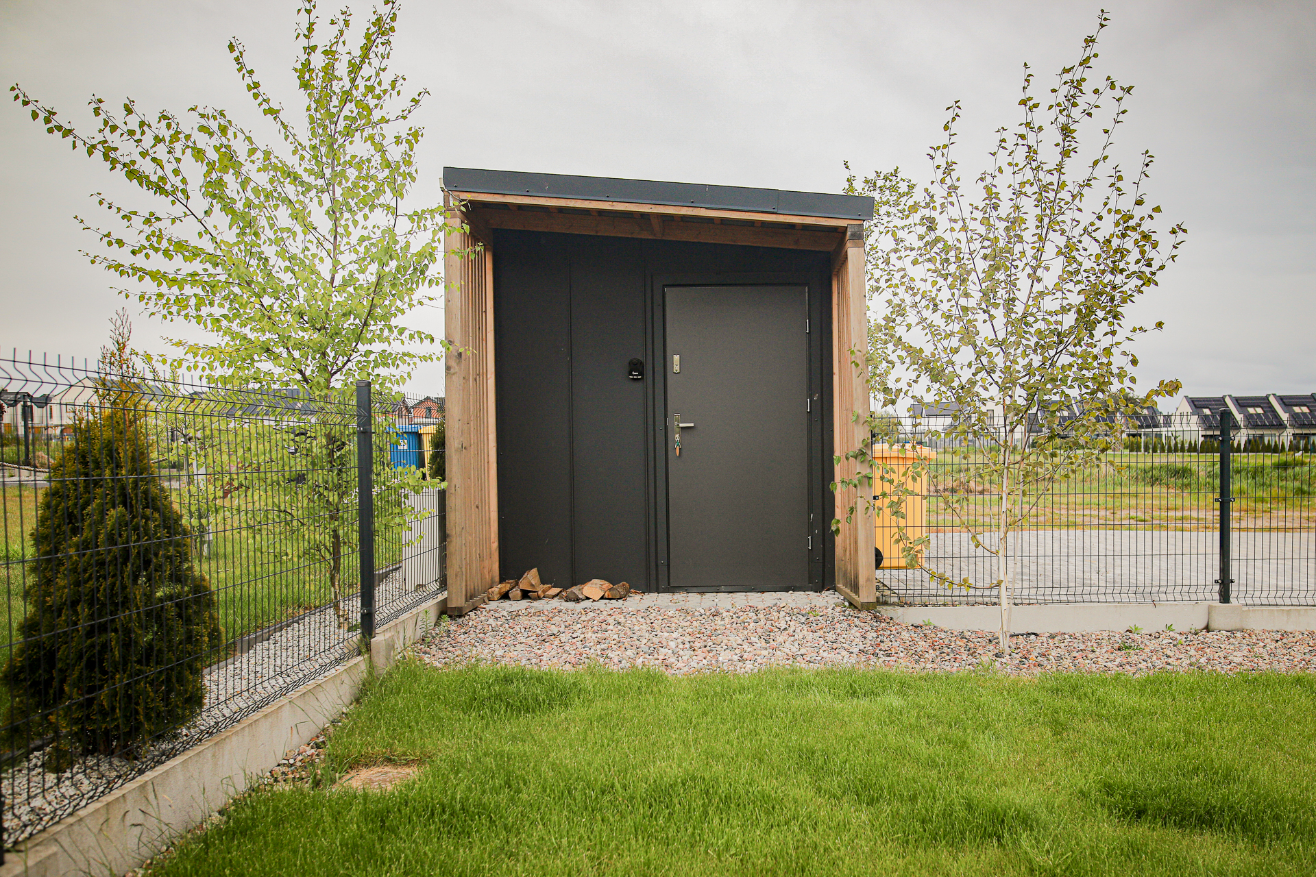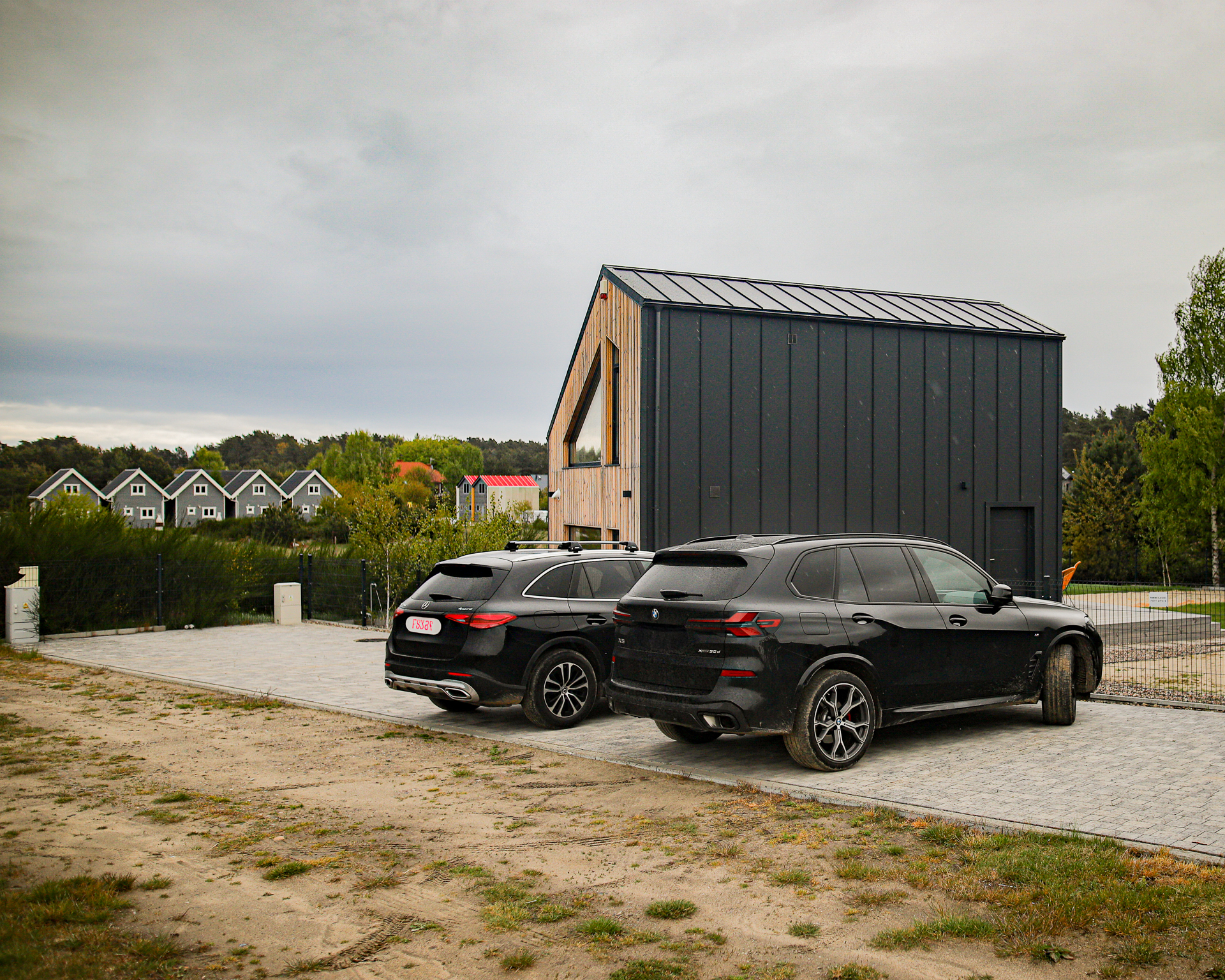 Prywatny parking oraz w pełni ogrodzona posesja z zadbanym trawnikiem, gwarantująca spokój i bezpieczeństwo.